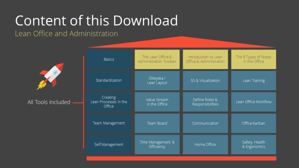 Each Toolbox contains PowerPoint and PDF templates for every Lean tool, along with practical workshop and training templates, step-by-step implementation guides, and supporting videos. Every tool is equipped with detailed resources, enabling you to immediately introduce Lean methods and build a Lean Production System in your own organization.